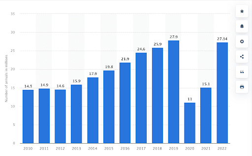 שימו לב לגרף הבא שמתאר את מספר התיירים בפורטוגל (במיליונים). כמות שהכפילה את עצמה תוך עשור מאז 2010 (הירידה היא בתקופת הקורונה).
